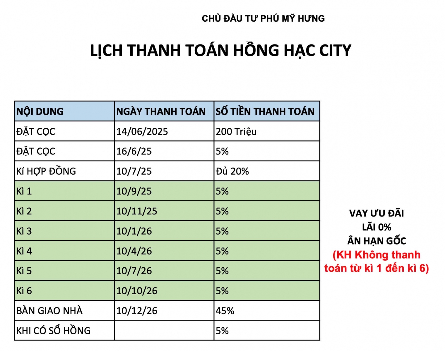 Lịch Thanh toán Giai đoạn mở bán đầu tiên, phân khu Hồng Phát ( Zone F1) trong vòng 18 tháng. Thời gian nhận nhà dự kiến là 10/12/2026, Khách hàng chỉ cần thanh toán trước 20% ký hợp đồng mua bán đến lúc nhận nhà.