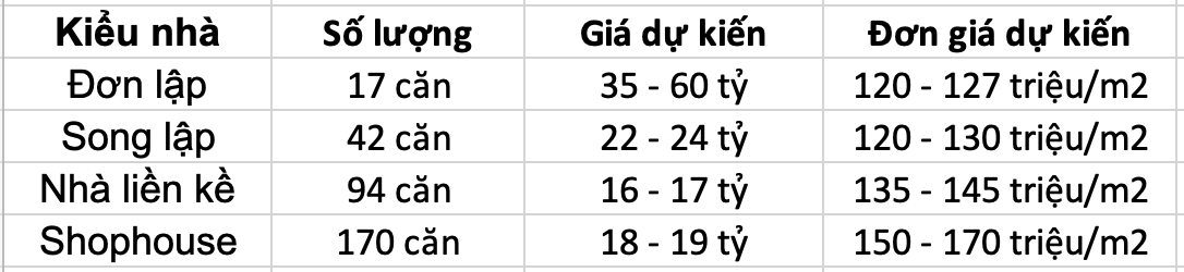 Giá bán (dự kiến chưa chính thức) các sản phẩm Hồng Hạc City phân bổ như sau: